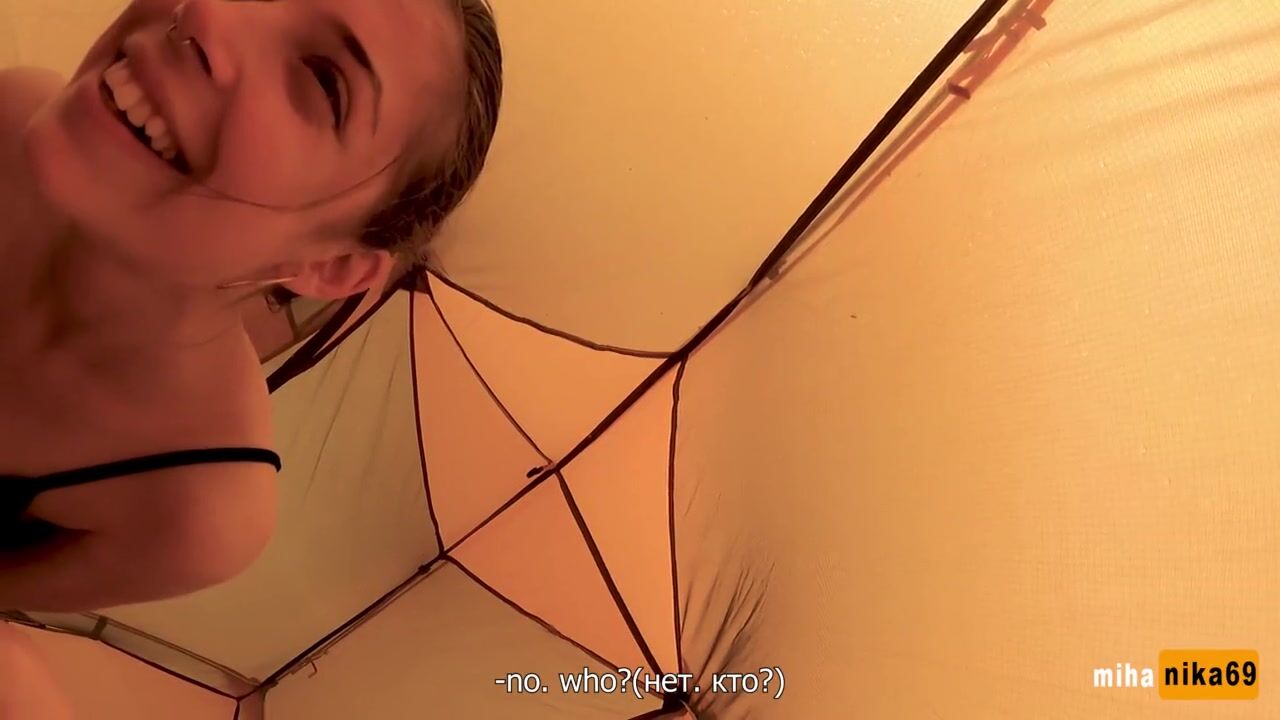 Русская парочка выбралась на выходных за город и расположилась в палаточном лагере рядом с такими же отдыхающими. Разумеется, присутствие вокруг целой толпы людей – явно не повод отказывать себе в интимной близости, поэтому очень скоро любовники закрыли свою палатку снаружи, принявшись творить всякие непристойности внутри. Девочка стянула с ебаря шорты и сделала ему глубокий минет, а после аккуратно взобралась на член. Парочке пришлось совокупляться очень осторожно и без звука, чтобы не потревожить бродящих туда-сюда соседей.