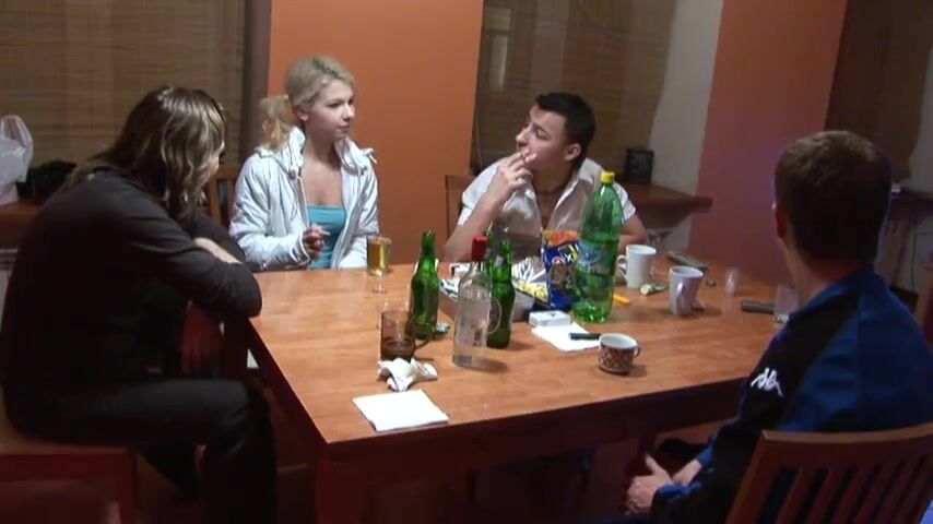 Группка предприимчивых парней пригласила на свою пьянку подругу одного из них. Молодые люди быстро положили глаз на симпатичную блондиночку и стали воплощать в реальность план по ее спаиванию. Девочке предложили пари – четыре стакана крепкого алкоголя и четыре долларовых бумажки. Та оказалась очень падкой на легкие деньги и с удовольствием согласилась, умяв все порции одну за одной. Теперь всей компании осталось только раздеть неспособную сопротивляться гостью и пустить по кругу, запихивая члены во все отверстия.